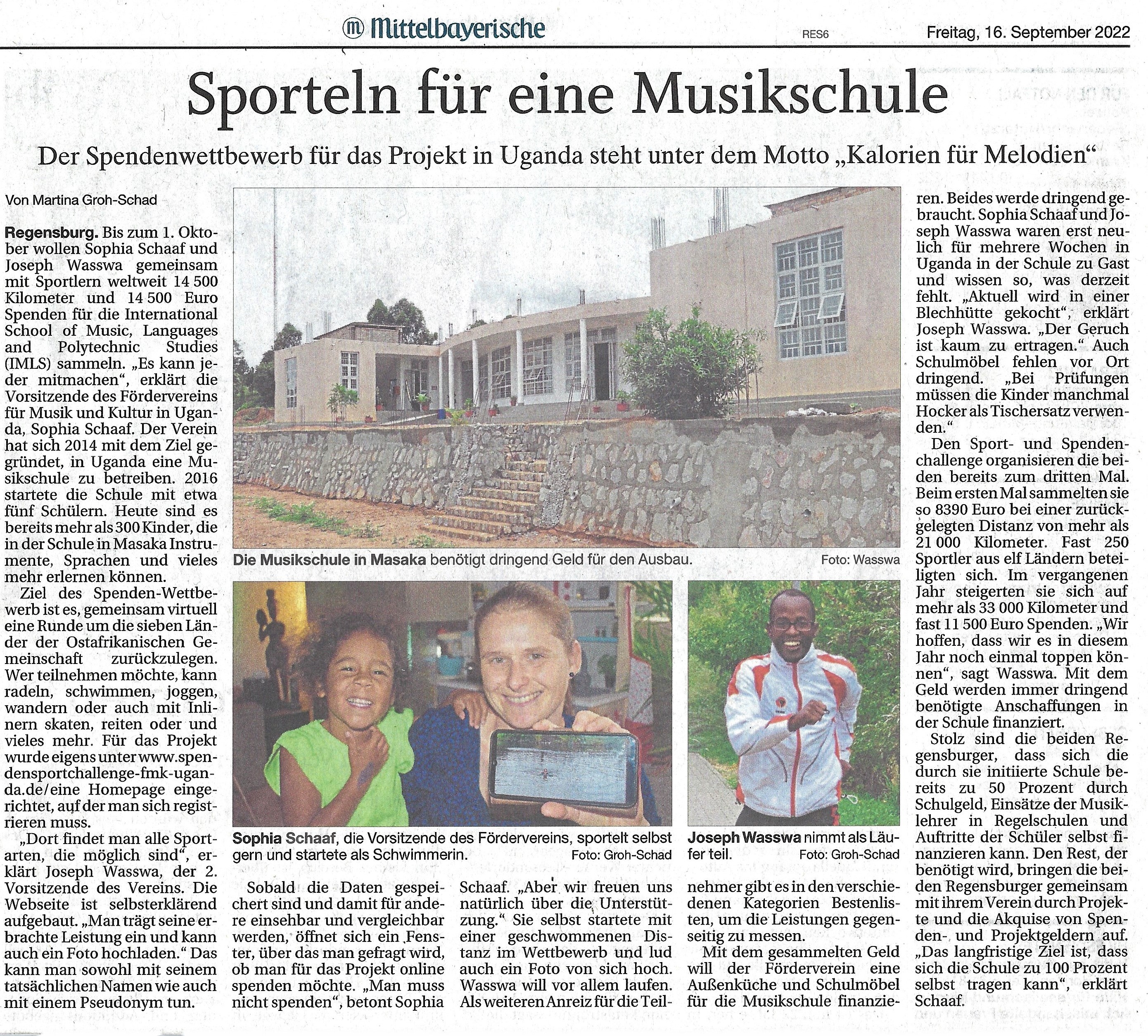 16. September 2022PresssestimmenMittelbayerische Zeitung: Sporteln für eine Musikschule Regensburg: Der Spendenwettbewerb für das Projekt in Uganda steht unter dem Motto: “Kalorien für Melodien” MZ 16.09.2022